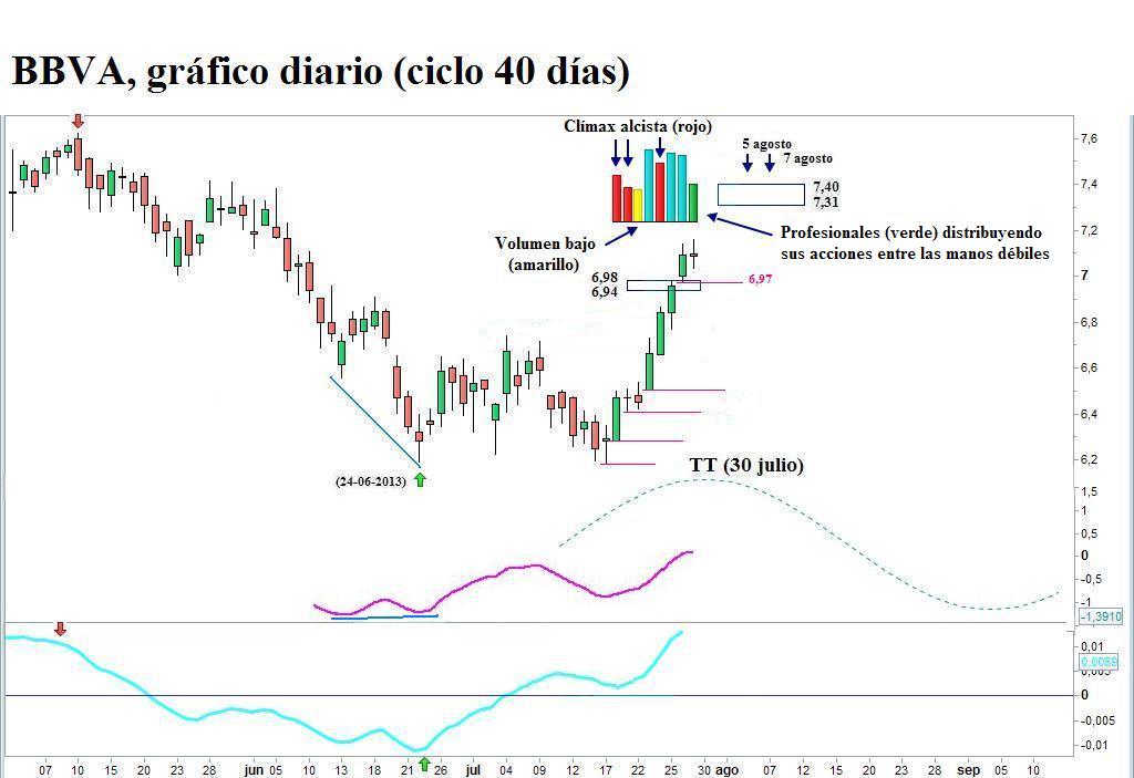 Dos son los aspectos que deseo abordar en este breve informe. Veamos, primero, el gráfico diario del BBVA.