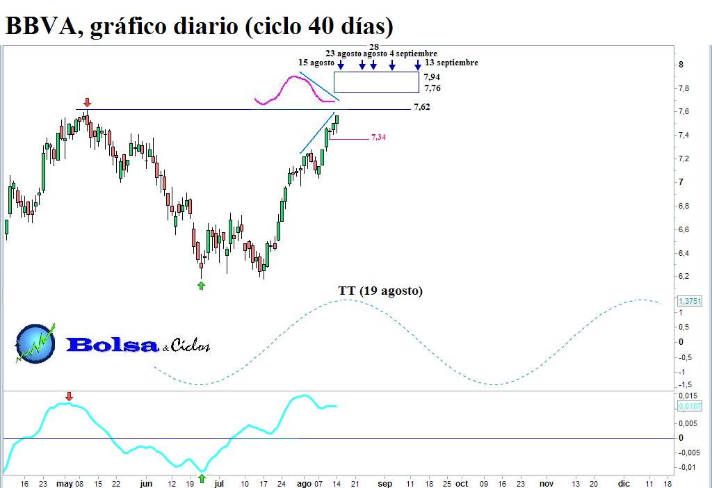 Lo más novedoso con respecto del anterior informe es que el precio acabó rompiendo la resistencia situada entre 7,31 y 7,40 (no mostrada ya en el gráfico). El nuevo objetivo de subida de la fase ascendente del ciclo de 40 días se ubica entre 7,76 y 7,94. No obstante, antes de alcanzar ese objetivo, el BBVA tendrá que lidiar con la resistencia obvia que nace del máximo marcado el 10 de mayo (7,62).