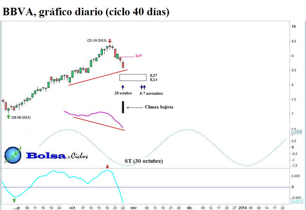Hecho añicos el soporte situado entre 8,79 y 8,70 (no mostrado ya en el gráfico), en buena lógica el BBVA debería acabar aterrizando en el siguiente objetivo de la fase descendente, localizado entre 8,37 y 8,14.