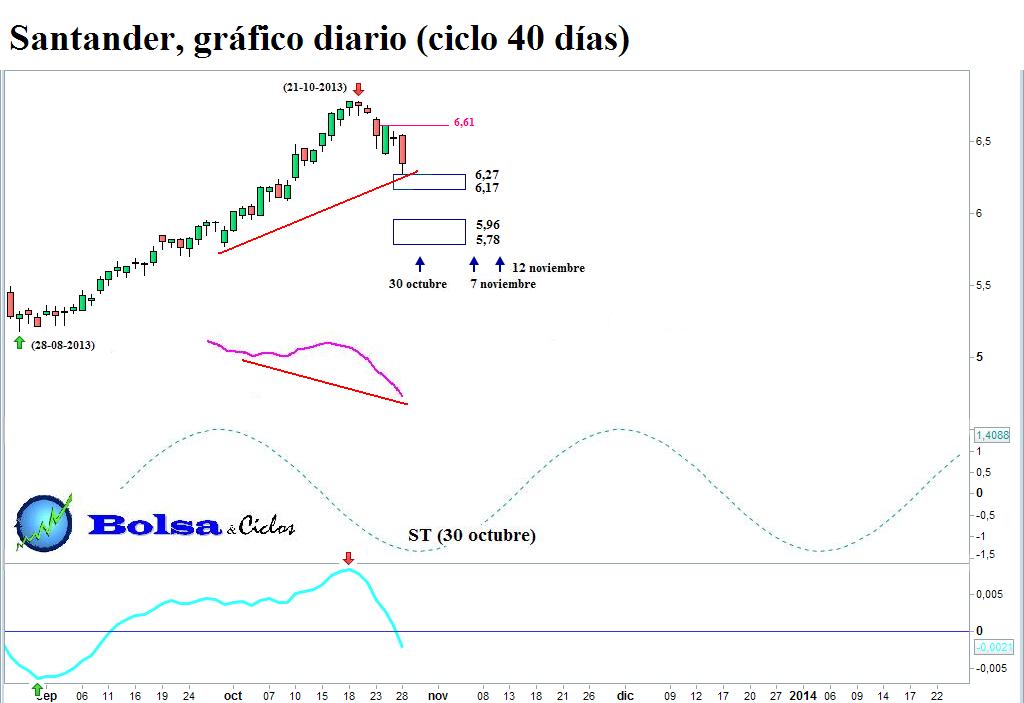 Tras formarse la cresta del ciclo justo en la jornada en que se cumplía el techo teórico (TT) previsto por la onda sinusoidal, el día 23 el precio rompió a la baja la línea horizontal situada en 6,61. Finalemente, ayer el oscilador de confirmación terminó por certificar el cambio de fase.