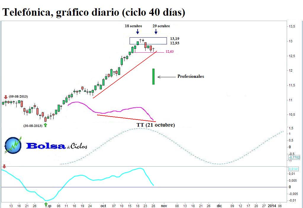Displicente y confiada, Telefónica sigue sin dar su brazo a torcer, permaneciendo aferrada con uñas y dientes a la fase ascendente de su ciclo de 40 días. De hecho, aunque se ha acercado peligrosamente, el precio no ha sido capaz de romper a la baja la línea horizontal situada en 12,63.