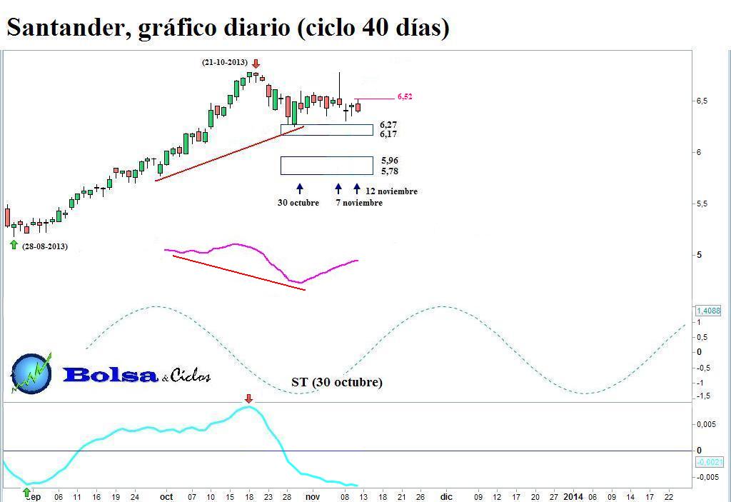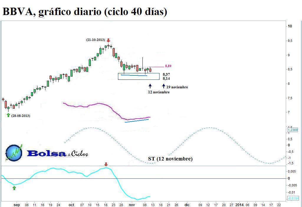 Que el soporte situado entre 8,37 y 8,14 atesora un extraordinario valor, no hace falta afirmarlo. Su peforación conllevaría un notable deterioro técnico del BBVA. En consecuencia, este valor haría bien en respetarlo, para evitarse males mayores. A favor de esta posibilidad reman conujntamente el cumplimiento ayer del suelo teórico (ST) y el indicador de momento, cuya divergencia alcista ofrece apoyo al precio. En cualquier caso, es este último el que debe dictar sentencia. Asi, para activar una señal de la posible conclusión de la fase descendente del ciclo, el precio debe romper al alza la nueva línea horizontal situada en 8,59.