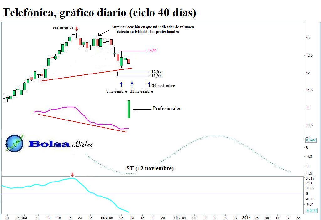 Más allá de que el precio terminó rompiendo definitivamente el soporte situado entre 12,58 y 12,38 (no mostrado ya en el gráfico), dos son los aspectos que me gustaría destacar sobre el ciclo de 40 días de Telefónica.