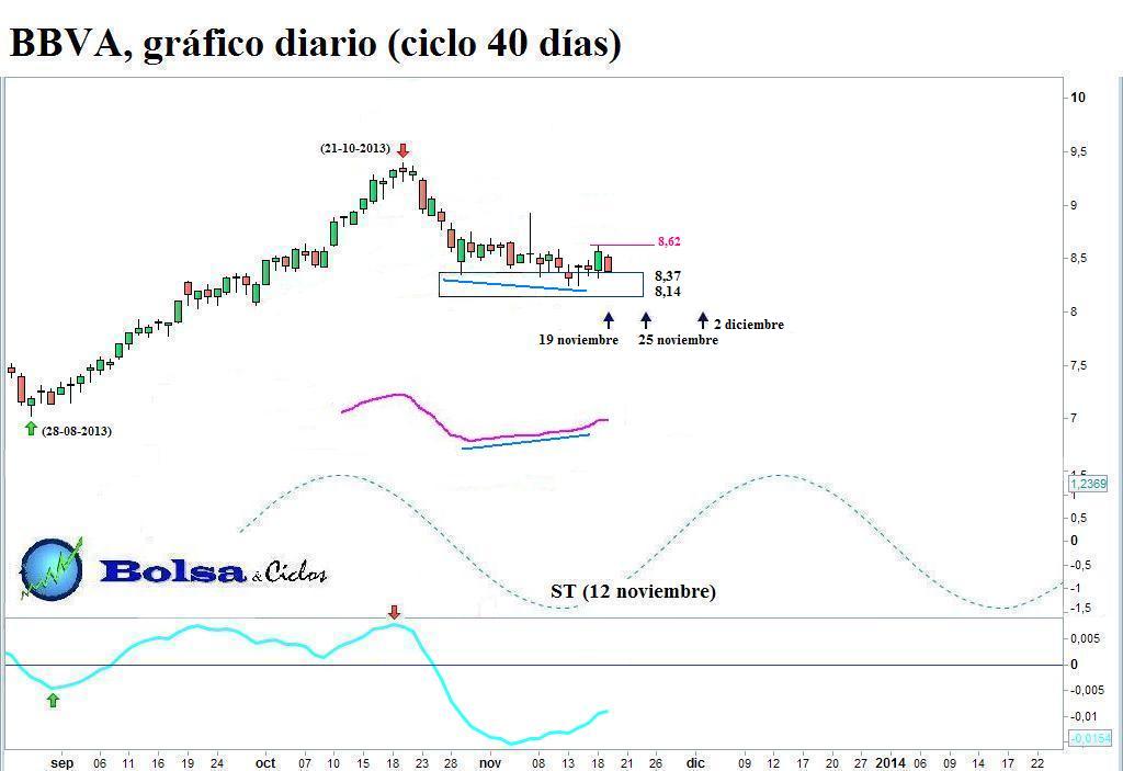 Sostenido todavía en el soporte que se localiza entre 8,37 y 8,14, el BBVA ha sido incapaz de romper al cierre la línea horizontal que se situaba en 8,59. En consecuencia, este banco sigue desaprovechando la divergencia alcista dibujada por el indicador de momento. Por lo que respecta al factor tiempo, debo decir que la onda sinusoidal no ha modificado el ST y que a la vibración de Gann que aparecía ayer, añado en este informe las que figuran respectivamente los días 25 de noviembre y 2 de diciembre.