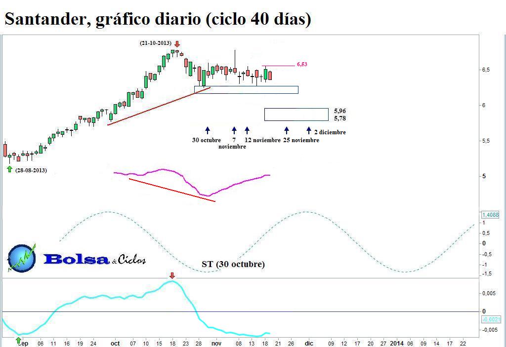 Pese a la divergencia inversa alcista del indicador de momento, que todavía permanece vigente, este banco tampoco ha logrado construir un tramo alcista brioso. De hecho, el indicador de momento ha ganado suficiente altura como para que cualquier nueva onda bajista del precio que forme mínimos decrecientes le permita dibujar una divergencia alcista. En el caso de este valor, la onda sinusoidal tampoco ha modificado su pronóstico sobre el ST. A todo esto, las dos siguientes vibraciones de Gann figuran respectivamente los días 25 de noviembre y 2 de diciembre.