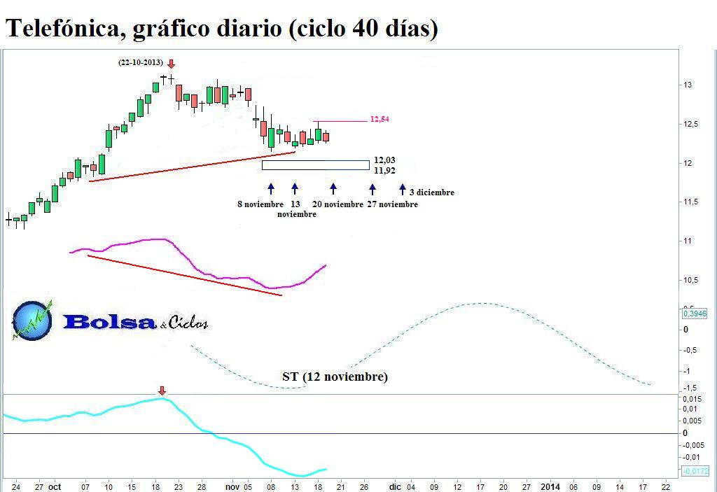 Vigente todavía, la divergencia inversa alcista del indicador de momento está siendo dilapidada por Telefónica, sometida a las mismas estrecheces de movimiento que sus compañeros del sector bancario. Fijando la vista en el factor tiempo, recuerdo que hoy figura una vibración de Gann capaz de forzar el suelo del ciclo. Dos vibraciones más aparecen respectivamente los días 27 de noviembre y 3 de diciembre.