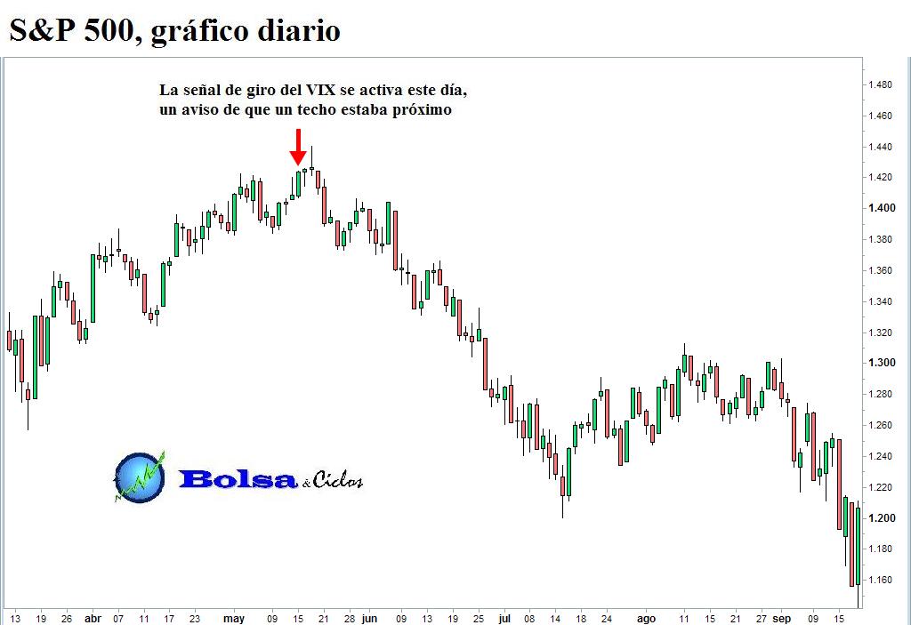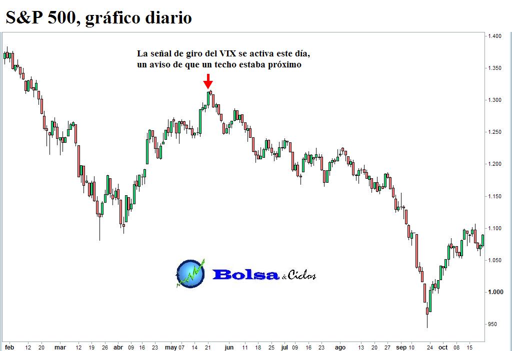 Desplacémonos ahora al pasado para ver algunos ejemplos que ilustren la eficacia de esta señal. El siguiente gráfico del S&P 500 abarca el período comprendido entre febrero de 2001 y octubre de 2001. Tras formar un suelo relevante en marzo, el índice norteamericano emprendió una espectacular subida de casi el 22% hasta formar techo en mayo. En verdad, el 21 de mayo se activó la señal de giro del VIX, de manera que los especuladores de medio plazo recibieron un aviso de que un techo de fuste estaba a punto de formarse. De hecho, al observar el gráfico resulta evidente que ese techo se constituyó sólo un día después de la señal. Un techo, por cierto, tras el cual el S&P 500 se despeñó gozoso. Tanto es así que desde el máximo marcado en 1.315,93, el S&P 500 procedió a embaularse una caída de 371 puntos (28,2%) hasta el mínimo formado el 21 de septiembre.