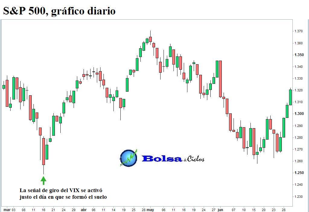 Si avanzamos algo más en el tiempo, una señal del VIX que avisaba de un suelo se desencadenó el 16 de marzo de 2011, justo el día en que se formó un suelo relevante tras el que vino un rebote del 10% hasta principios de mayo.