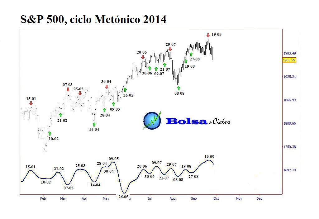 Para aquéllos que no lo recuerden, el ciclo Metónico promedia aquellos años en los que la fase lunar y el alineamiento del Sol, la Luna y la Tierra es similar a la del año en curso, de tal manera que puede predecirse la acción del mercado en un año concreto estudiando los gráficos de los años que tienen un similar alineamiento al año en cuestión.