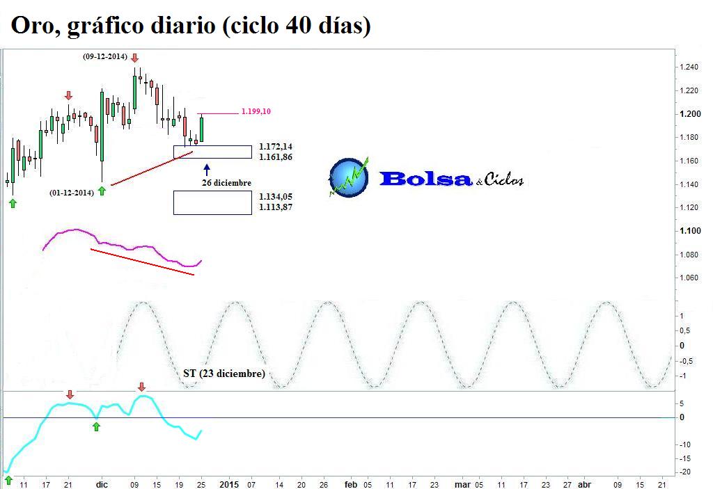 Al cierre de la sesión del 26 de diciembre, la situación técnica del oro se presentaba como sigue: su ciclo de 40 días se encontraba en la fase descendente; el precio había aterrizado en el soporte que se localizaba entre 1.172,14 y 1.161,86; el suelo teórico (ST) se había cumplido dos días antes y una vibración de Gann susceptible de forzar un suelo había entrado en escena ese mismo día; además, mi indicador de momento dibujaba una divergencia inversa alcista (líneas rojas).