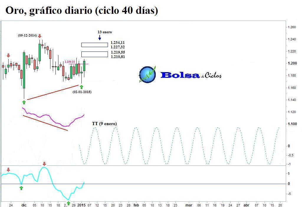 Por último, disponíamos de línea horizontal situada en 1.199,10, cuya rotura al alza activaría la señal de posible conclusión de la fase descendente del ciclo de 40 días.