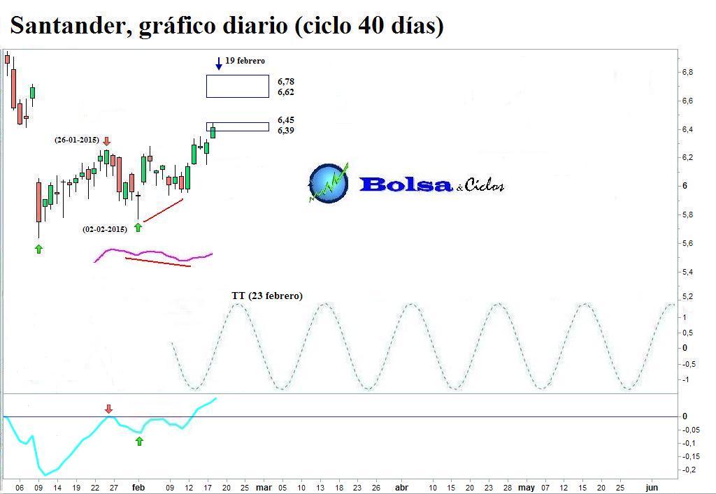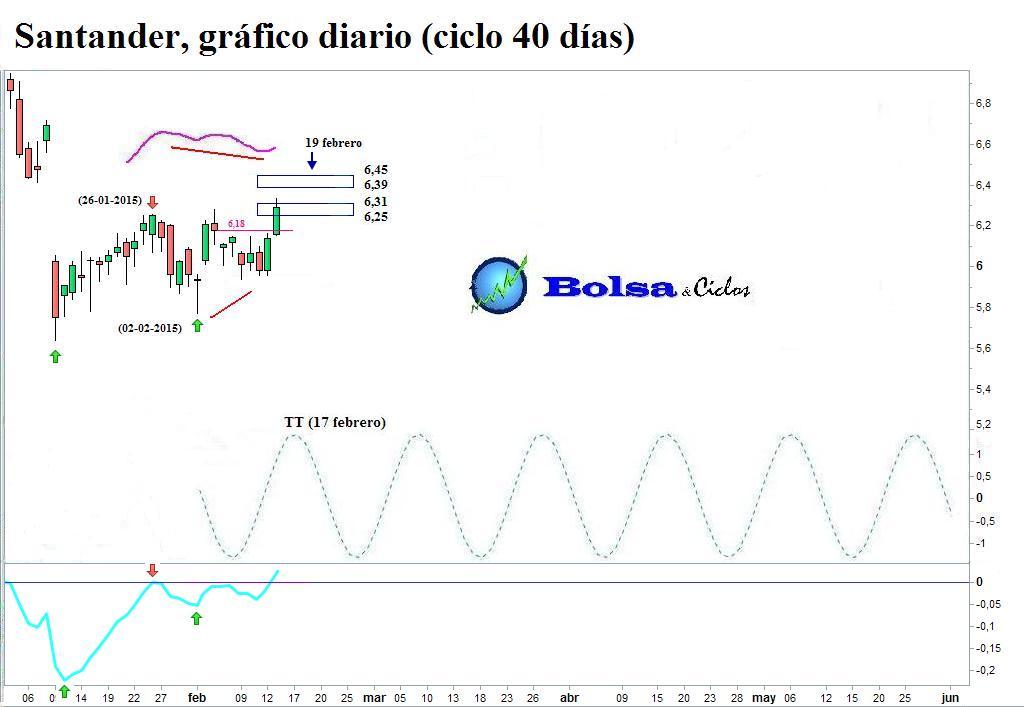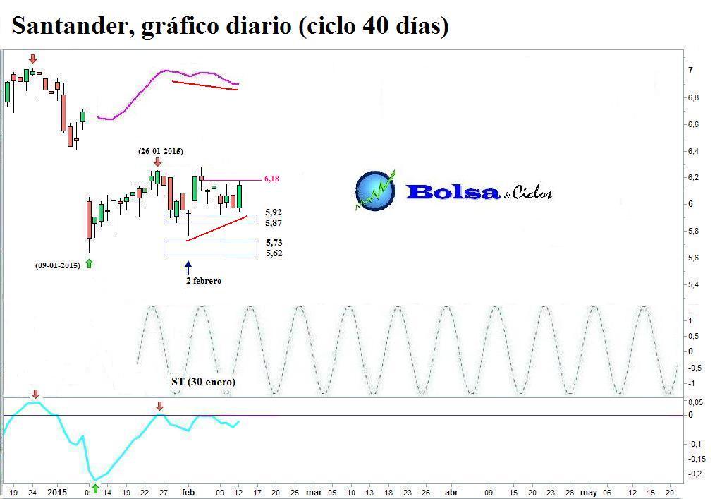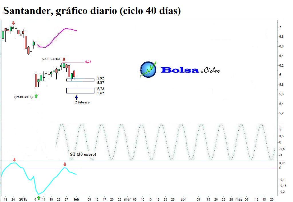 El 2 de febrero, la situación técnica del Santander se presentaba como sigue: el ciclo de 40 días se encontraba en su fase descendente; el precio había percutido contra el soporte localizado entre 5,92 y 5,87; el suelo teórico (ST) previsto por la onda sinusoidal se había cumplido el 30 de enero; y una vibración de Gann capaz de forzar un suelo iba a irrumpir exactamente el 2 de febrero.