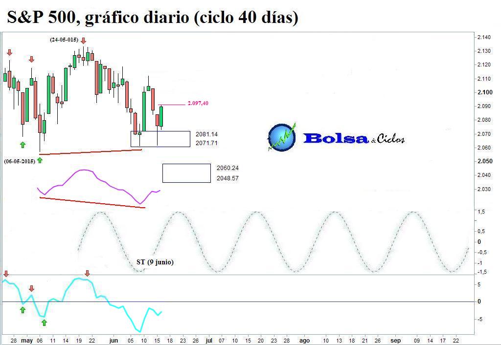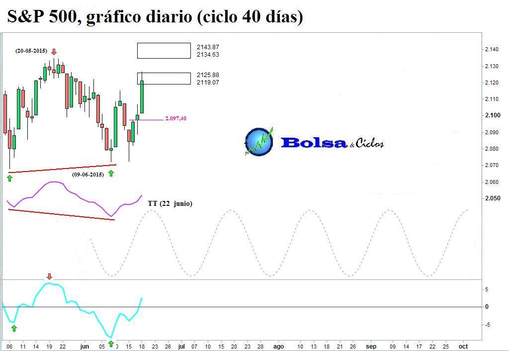 Entretanto, disponíamos de la línea horizontal situada en 2.097,40 cuya rotura al alza activaría la señal de posible conclusión de la fase descendente del ciclo de 40 días. A continuación, muestro el gráfico que publiqué el 17 de junio por la mañana.