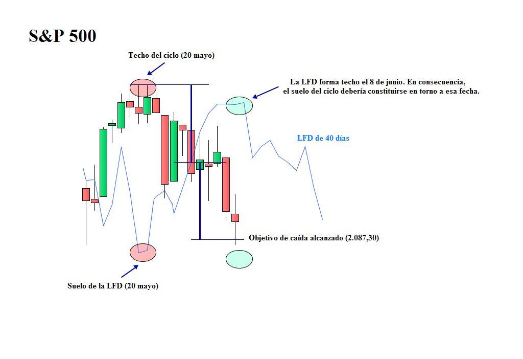 Vamos a echar una ojeada al diagnóstico elaborado por la LFD de 40 días del S&P 500, para ver si confirma el dictamen de mis instrumentos de análisis.
