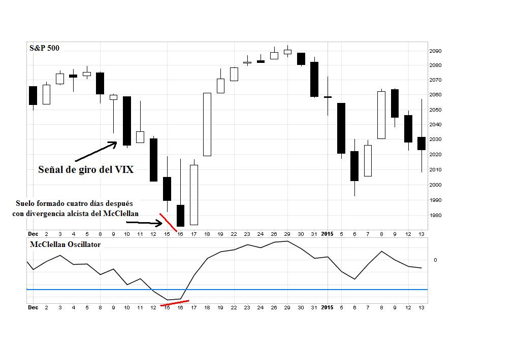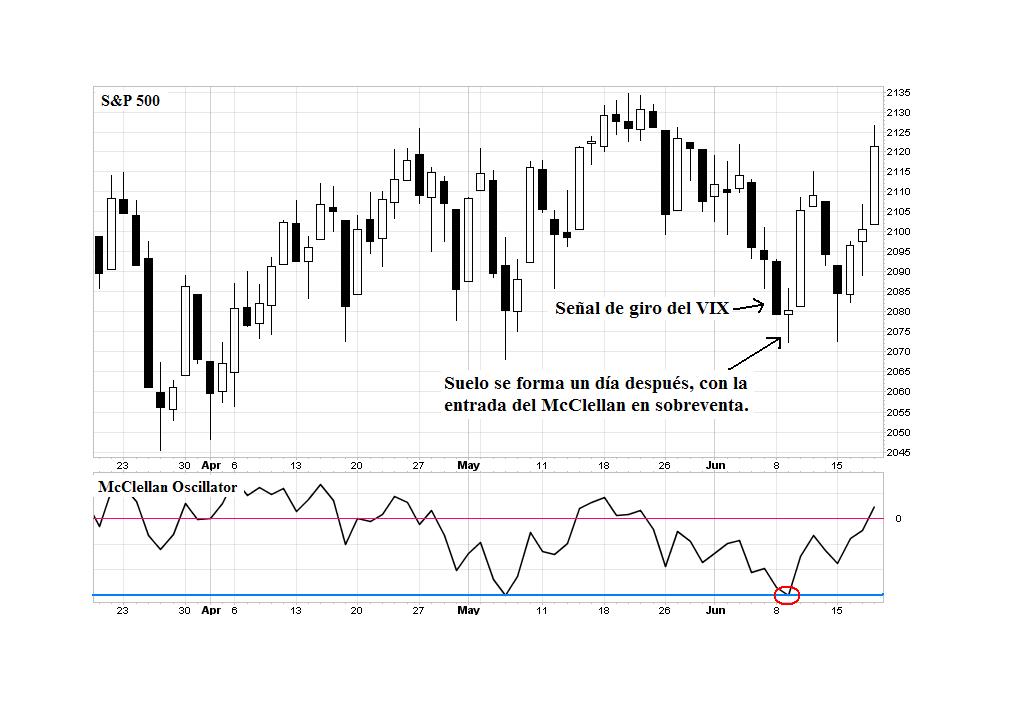 Una vez generada la señal, lo habitual es que el McClellan incurra en sobreventa (cosa que sucedió el 9 de junio) y después forme una divergencia alcista con el S&P 500. Esto es exactamente lo sucedió la última ocasión en que había hecho acto de presencia esta señal, el 10 de diciembre del año pasado,. Cuatro días después se formó un suelo de fuste. Antes, el McClellan Oscillator había incurrido en sobreventa y acto seguido había dibujado una divergencia alcista.