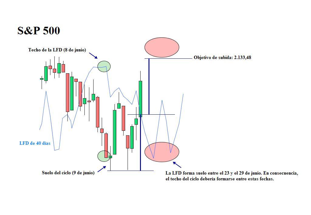 Y hablo de suelo cíclico porque el 17 de junio el S&P 500 rompió al alza la línea horizontal que se situaba en 2.097,40, y un día después el oscilador de confirmación certificó que el suelo del ciclo ya queda a nuestras espaldas. Por cierto, el S&P 500 ya ha coronado el primer objetivo de subida de la fase ascendente.