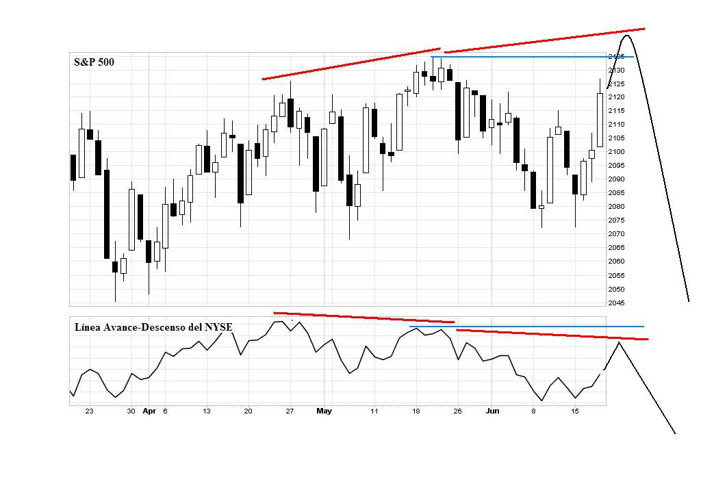 En otro orden de cosas, me gustaría plantear un posible escenario. Imaginemos que el S&P 500 sea capaz de superar el máximo que formó el 20 de mayo, algo probable considerando la poca distancia que le separa de ese nivel.