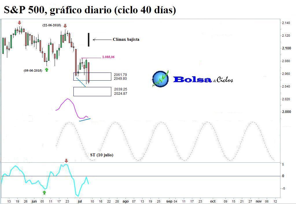 El 8 de julio la situación técnica del ciclo de 40 días del S&P 500 se presentaba como sigue: el ciclo se encontraba en su fase descendente; el precio había aterrizado en el soporte localizado entre 2.061,79 y 2.049,80; mi indicador de momento dibujaba una divergencia alcista (líneas azules); y el suelo teórico (ST) previsto por la onda sinusoidal iba cumplirse el 10 de julio.