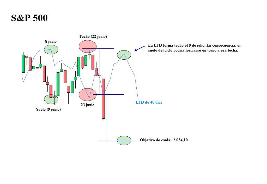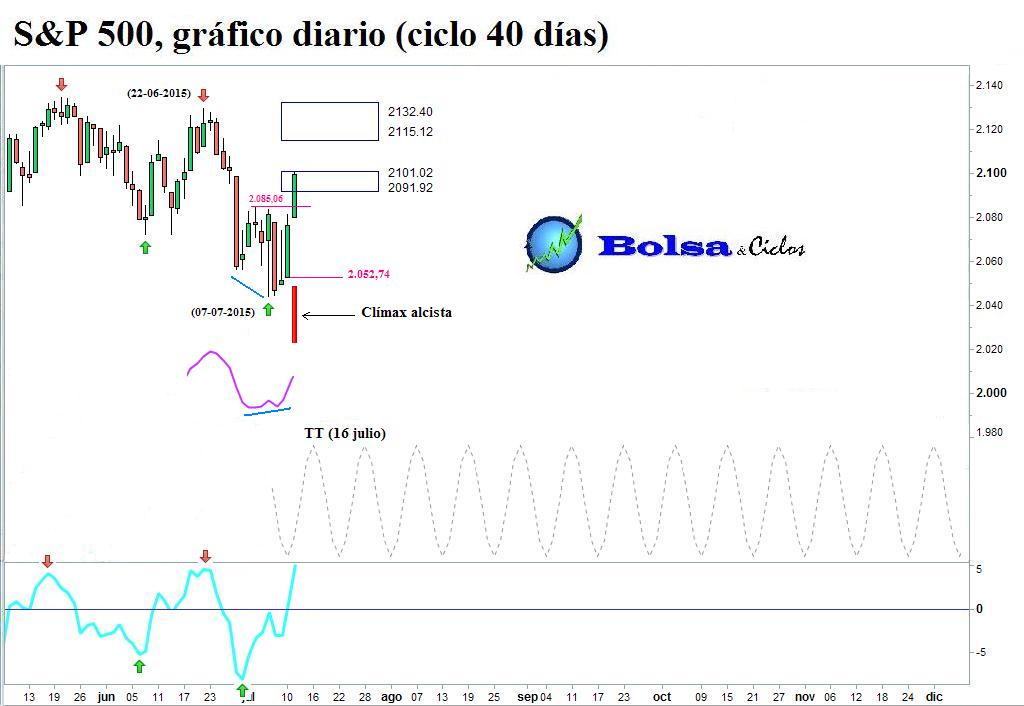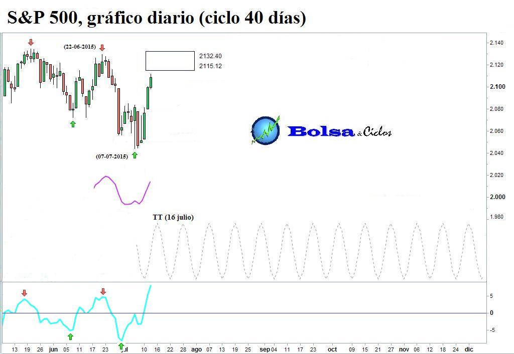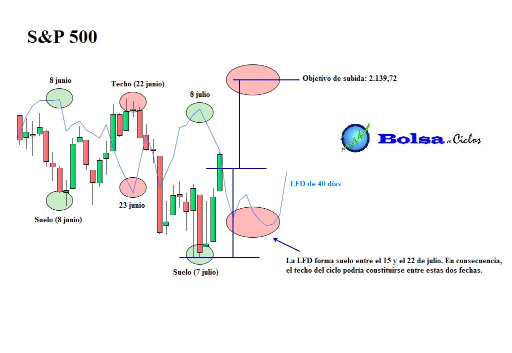 Entretanto, disponíamos de la línea horizontal situada en 2.085,06 cuya rotura al alza activaría la señal de posible conclusión de la fase descendente del ciclo de 40 días. A continuación, muestro el gráfico que publiqué el 9 de julio por la mañana.