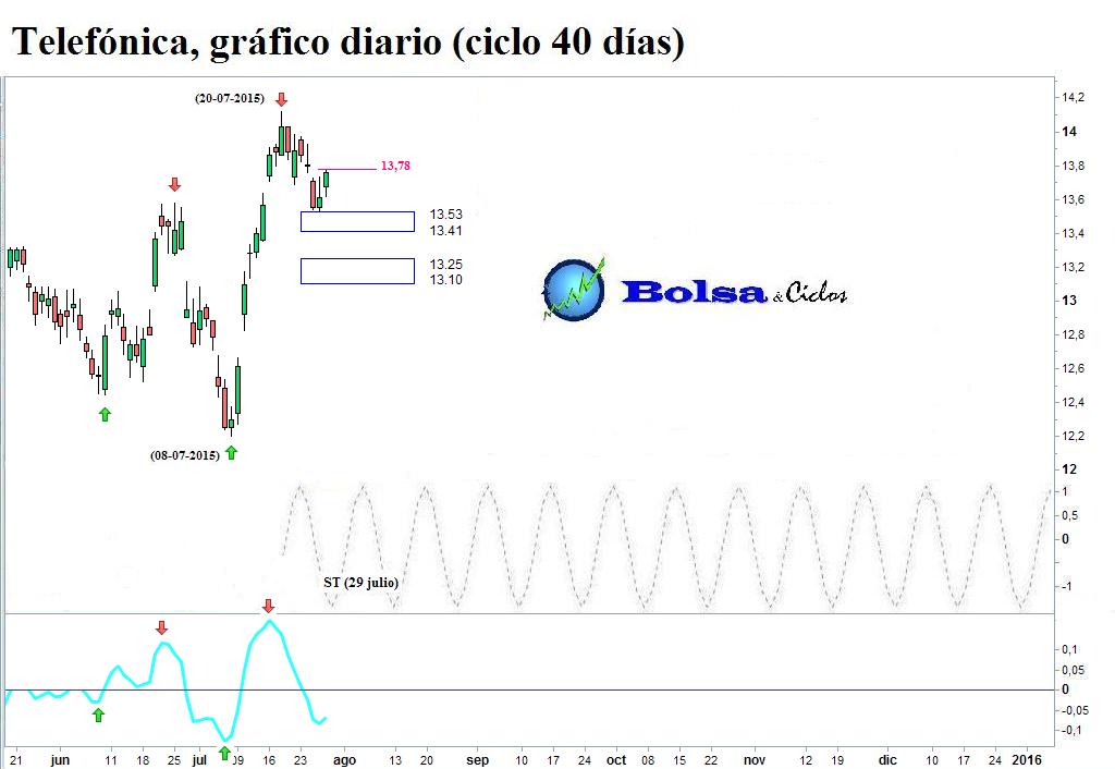 El 29 de julio, la situación técnica de Telefónica se presentaba como sigue: el ciclo de 40 días se encontraba en su fase descendente; el precio había conseguido detener su corrección al entrar en contacto con el soporte localizado entre 13,53 y 13,41; y el suelo teórico (ST) previsto por la onda sinusoidal se cumplía exactamente ese día.