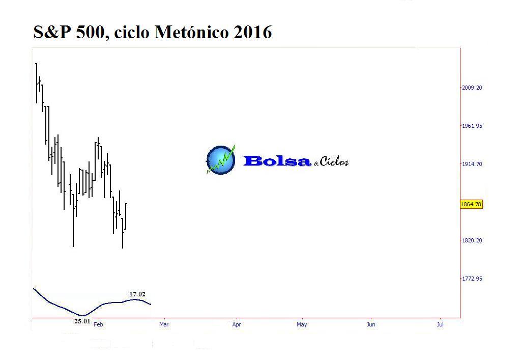 A todo esto, el Ciclo Metónico pronosticaba el siguiente cambio de dirección del S&P 500 para el 17 de febrero (el augurio para el resto del año no se muestra en el siguiente gráfico). Por tanto, todo apuntaba a la formación inmediata del suelo cíclico.