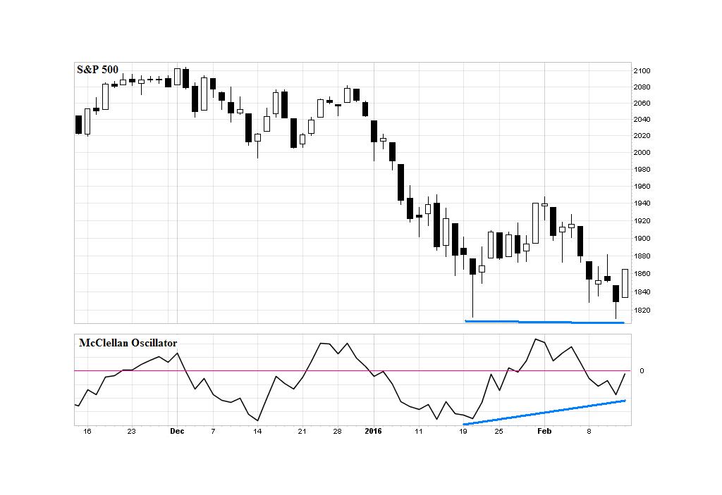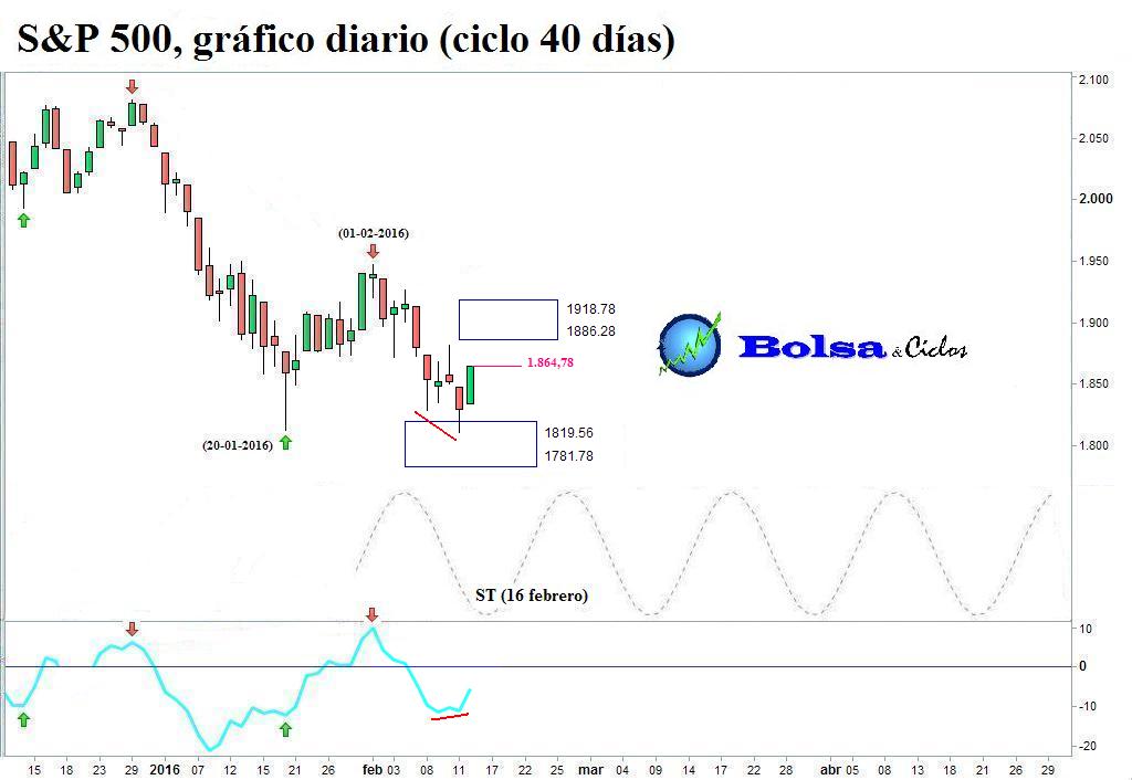 El 11 de febrero, la situación técnica del ciclo de 40 días del S&P 500 se presentaba como sigue: el ciclo se encontraba en su fase descendente; el precio había percutido contra el soporte localizado entre 1.819,56 y 1.781,78; el oscilador de confirmación dibujaba una divergencia alcista; y el suelo teórico (ST) previsto por la onda sinusoidal iba a cumplirse el 16 de febrero.