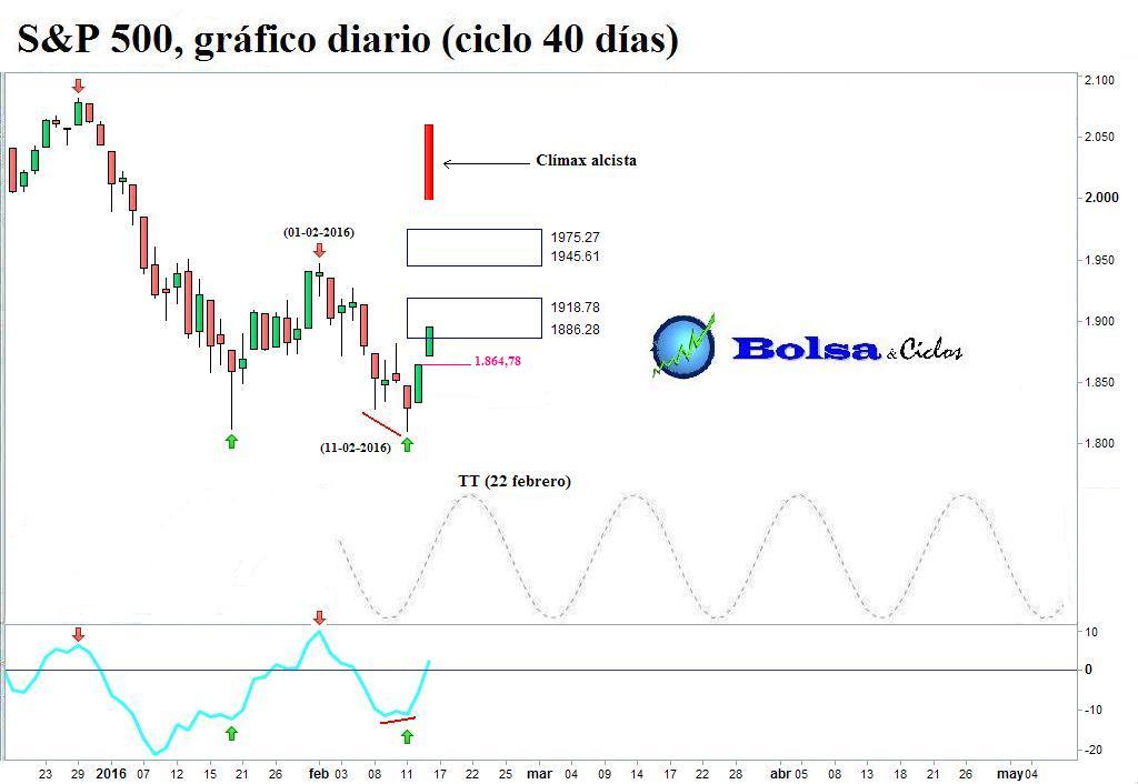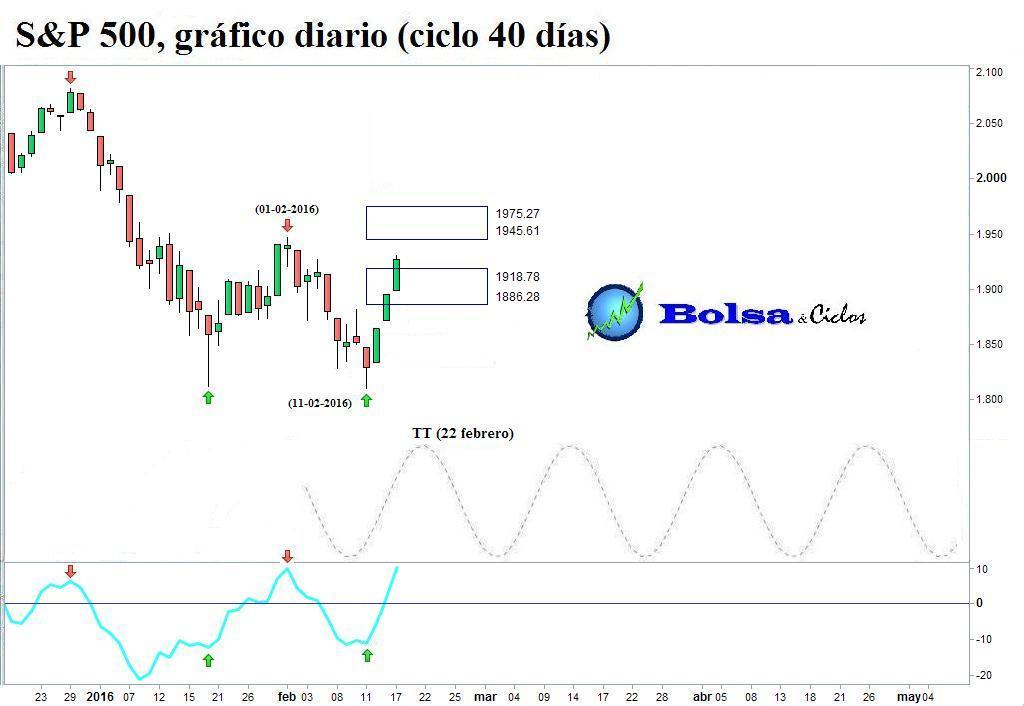 Por añadidura, disponíamos de la línea horizontal situada en 1.881,60, cuya rotura al alza activaría la señal de posible conclusión de la fase descendente del ciclo de 40 días. A continuación, muestro el gráfico que publiqué el 12 de febrero.