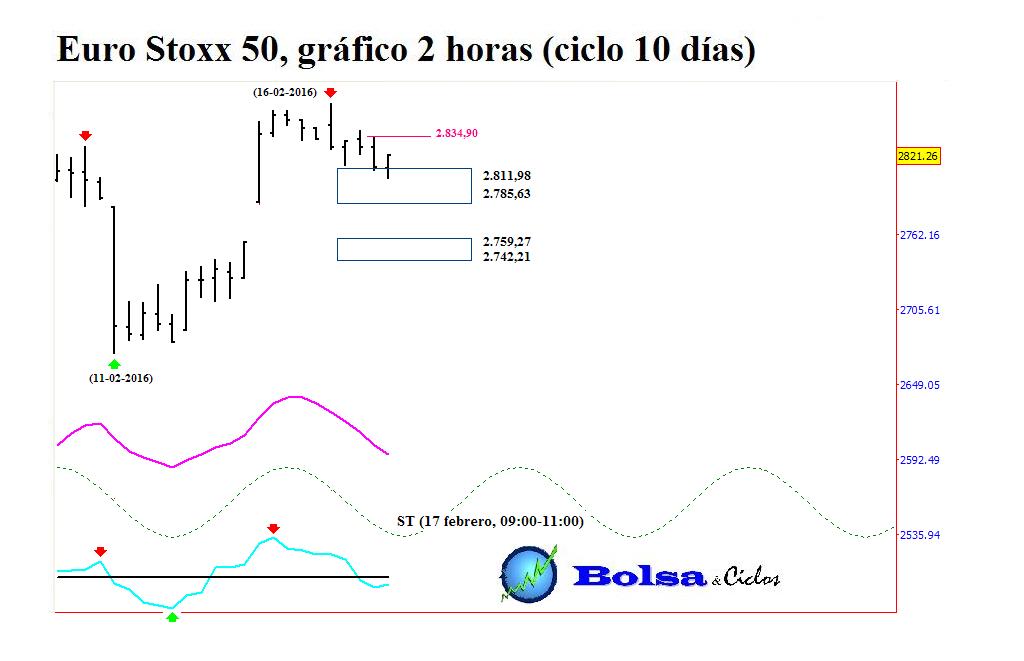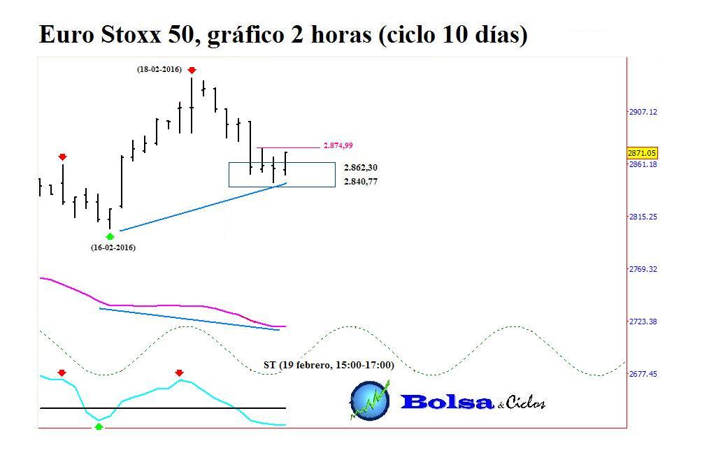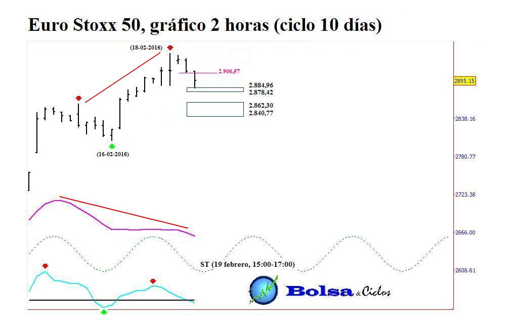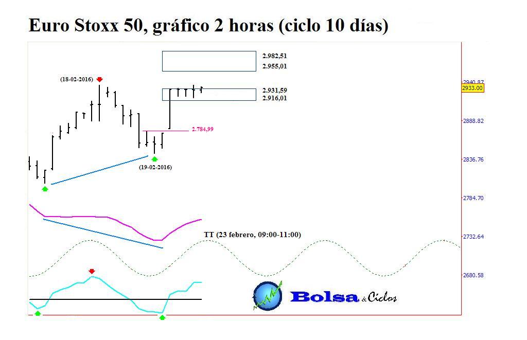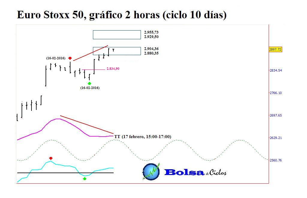 Con la sola ayuda de los gráficos, a modo de plano secuencia, voy a mostrar cómo mis herramientas de análisis han monitorizado la reciente evolución del ciclo de 10 días del Eurostoxx 50, adelantándose a cada oscilación significativa del índice mediante la rotura al alza y a la baja de las líneas horizontales, la llegada a los objetivos de subida y bajada, las divergencias alcistas y bajistas del indicador de momento y los suelos y techos teóricos (STs y TTs).