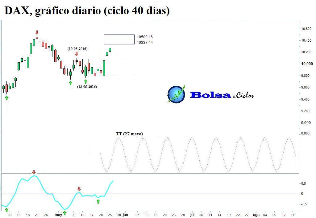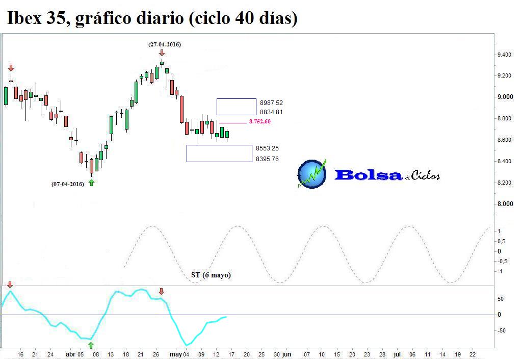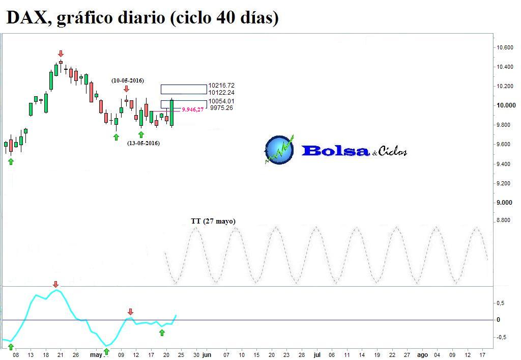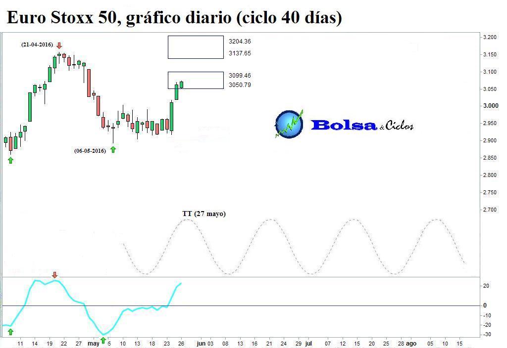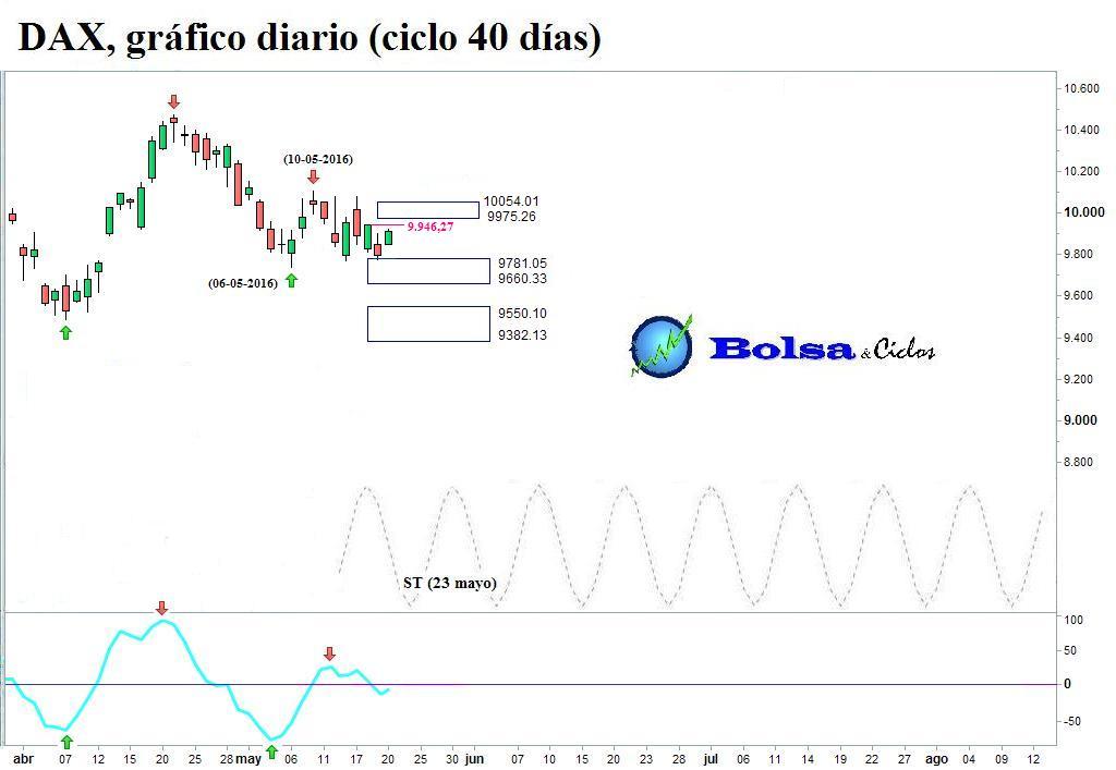 A modo de plano secuencia, muestro cómo mis herramientas de análisis han monitorizado la reciente evolución del ciclo de 40 días del Euro Stoxx 50, Ibex 35 y DAX. Los tres índices habían percutido contra los objetivos de caída. Además, los suelos teóricos (STs) apoyaban un cambio de dirección en el viento cíclico.