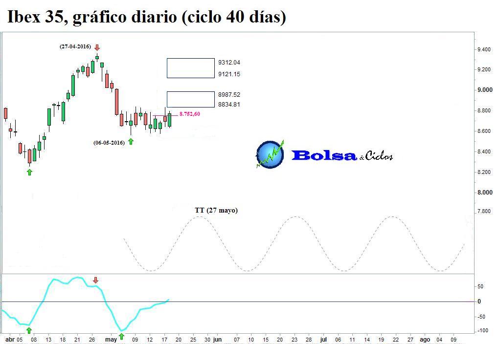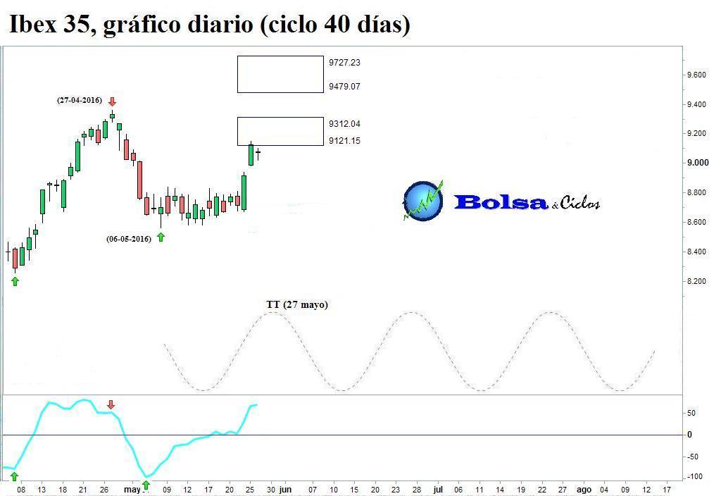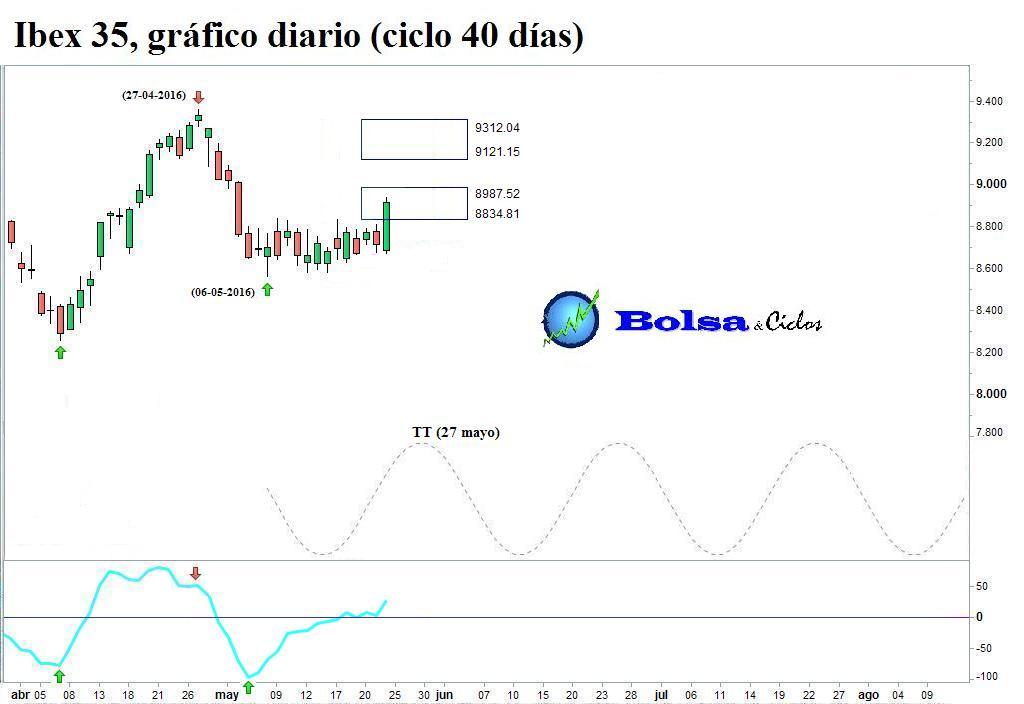 La rotura al alza de las líneas horizontales desencadenó una señal alcista en los tres índices, corroborando que el ciclo de 40 días había formado suelo en todos ellos.