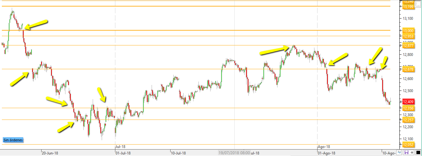 Hemos dejado esos rectángulos de la anterior figura para que se vean junto con los niveles calculados. Los que aparecen de color naranja son los del año 2018. Si usted se fija bien verá con qué precisión el precio va a buscarlo en un sentido o en otro y reacciona perfectamente. Los azules son los del año 2017 y tenían mayor amplitud entre ellos. Pero esa mayor amplitud se puede luego mejorar con niveles mensuales, semanales y diarios. Y sí, efectivamente, los niveles se calculan según sea en time frame que se va a analizar y a trabajar. Por ejemplo para intradiario se utilizan como "referentes lejanos" estos que salen del gráfico diario. Y luego, si voy a trabajar en gráficos de 1 hora ó 15 minutos calculo los mensuales, semanales y diarios para saber cómo reaccionará el precio en cada sesión. En el siguiente pos ampliaremos esta información mostrando ejemplos pero además acompañado de un vídeo exclusivo para los lectores y usuarios de Rankia ya que será la mejor forma que usted lo vea y entienda. Pero si cree que soy un charlatán evalúe mientras tanto este gráfico de 1 hora con esos mismo niveles: