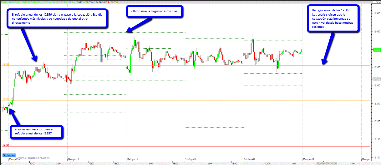 Esta forma de calcular SOR es muy usada y quizás por eso mismo su funcionamiento ya no es tan válido como lo fue en el pasado (digo "quizás" porque a lo mejor tienes un método basado en ellos y te funciona, pero a mi me dejó de hacerlo hace años). Pues igual que mediante unos simples cálculos se sacan niveles Pivots Point yo los saco haciendo mis propios cálculos. Y a la vista está que de forma diaria se cumplen. Voy a poner debajo el gráfico del DAX de esta semana como ejemplo pero puedes ir viendo los análisis de estas dos semanas y comprobar cómo el precio cuando llega a un nivel lo respeta y eso es lo que hace que se pueda negociar con eficacia, pero esto lo explicaré un poco más abajo. Ahora veamos: