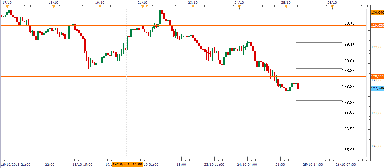 El cruce de divisas EUR/JPY también ha perdido el refugio 128.111 y puede dar oportunidad de negociar los SOR intradiarios si las palabras de Mario Dragui no consiguen tranquilizar a los inversores. En ese caso, con el eje central de operaciones de hoy situado en 127.86 que ejerce doble barrera al estar muy cerca del refugio 127.86 podría llevar a la cotización hacia los siguientes soportes intradiarios calculados:
