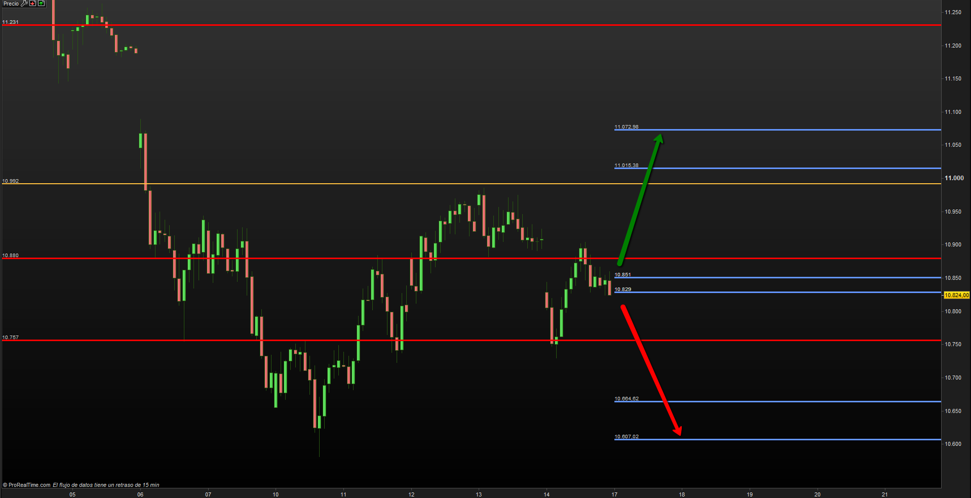 Probabilidad alta que la cotización vuelva a la zona del mínimo de la semana pasada en la serie de 60 minutos que coincide aproximadamente con el S2 semanal para realizar un pullback y de ahí impulsarse nuevamente en busca del refugio anual 10.992. También el pullback puede ser en la zona del refugio mensual 10.757 que ha cortado el paso a la cotización en dos ocasiones. Habrá que estar atentos a la pérdida de este nivel o a su apoyo para ver dónde se realizar el pullback.