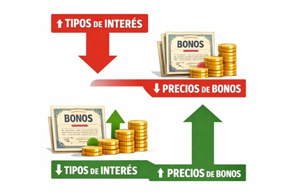 La relación es bastante clara: cuando los tipos suben, los precios de los bonos tienden a bajar; cuando los tipos bajan, suele pasar lo contrario.