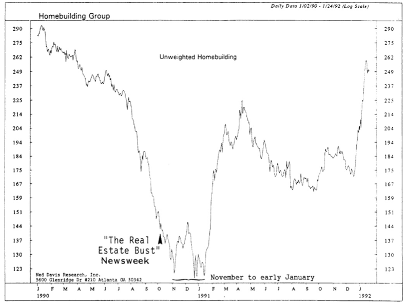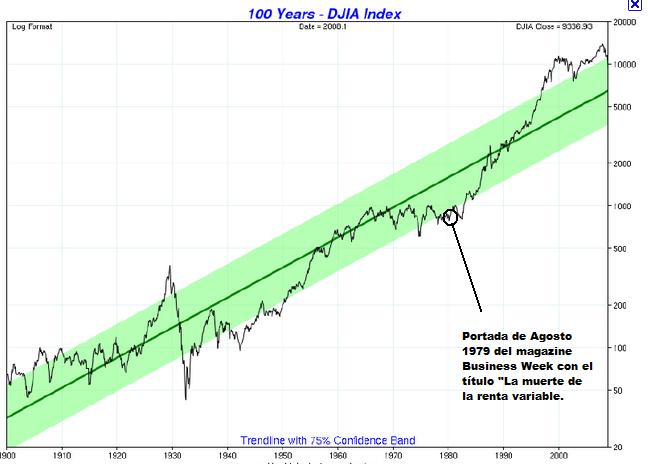 Las portadas de magazines y periódicos es una herramienta habitual del operador "contrarian". Esta portada de BusinessWeek es todo un icono del Contrarian Investing. En ella se titula "La muerte de las acciones". Como se ve en el gráfico del Dow Jones, el momento de publicación de este magazine coincidió con un suelo histórico del mercado.