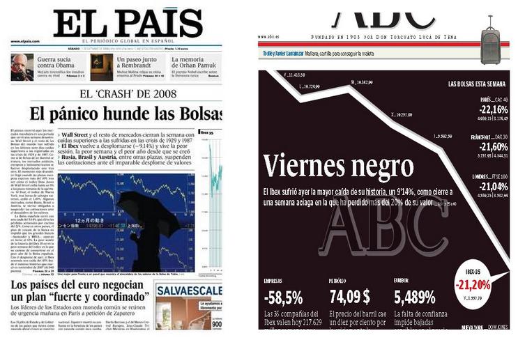 En la imagen se ve las portada de Elpais y del ABC en octubre de 2008. Cuando esto ocurra, le repito, cuando un medio generalista publique en portada un titular así ponga todo su dinero en bolsa. Es el momento óptimo para invertir.