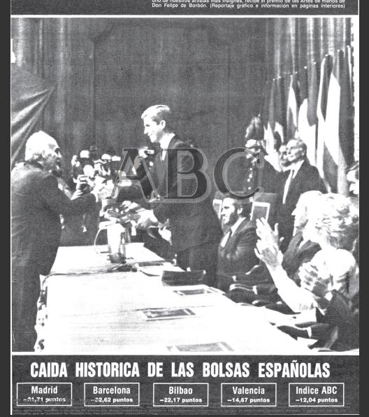 También he puesto la portada del ABC tras el crash de 1987. En la imagen la entrega de los príncipes de Asturias, pero el titular a pie de página es explicito: un medio generalista con un titular sobre bolsa, nunca fue mejor momento para comprar.
