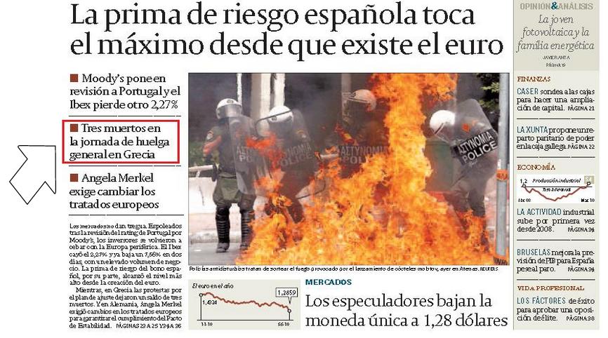 Por supuesto fue un mínimo del mercado durante el verano de 2010. El lema de este blog es una frase de Rothschild que dice "compra cuando haya sangre en las calles", y no hay portada que ejemplifique mejor este lema. Mire la foto, el fuego, la noticia de la izquierda hablando de muertos. Abajo hablando de como los especuladores fuerzan el euro a la baja (por cierto se recuperó para la fecha de publicación de este artículo).