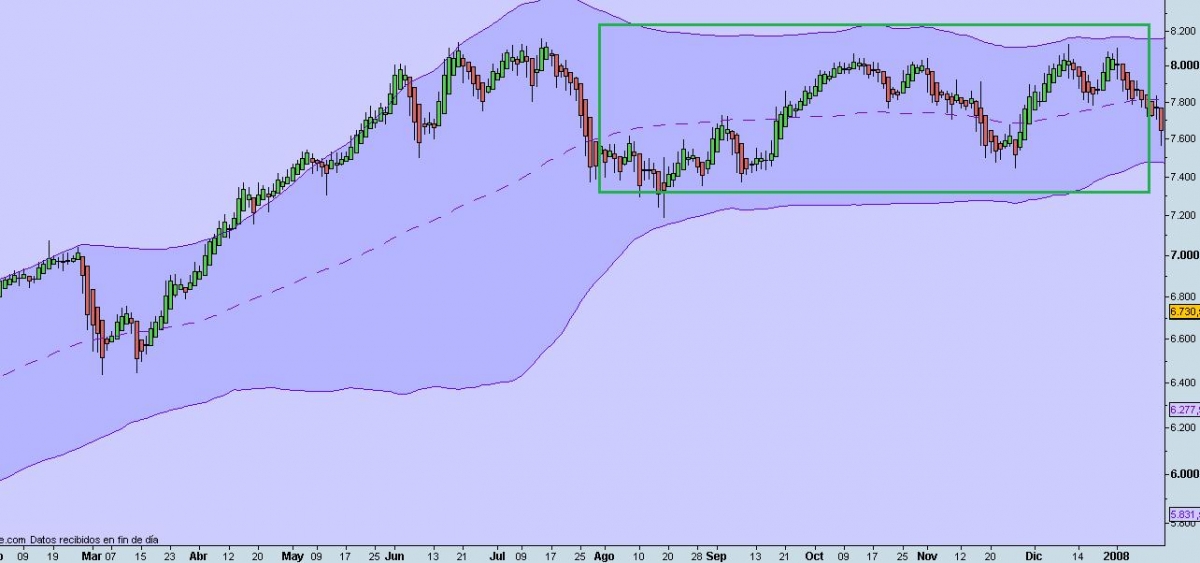 A su vez después de un movimiento tan direccional podemos pensar que el mercado descansará en algún momento. ¿Cúando ocurre eso? Pues como puse en el segundo gráfico de este post, cuando la banda contraria de la dirección que ha tomado el precio, empieza a cerrarse. Mire otra vez aquélla imagen.