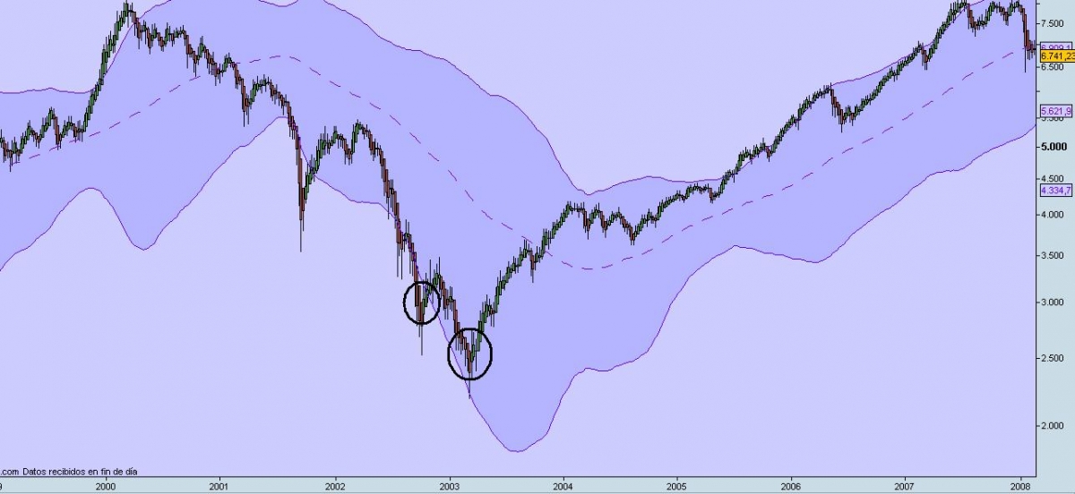 Este ejemplo era en un gráfico de 5 minutos, pero lo cierto es que se da en todos los periodos y muchas veces marca el final de un mercado alcista. En el siguiente gráfico del DAX en el suelo de 2003. Se ve el patrón del precio por fuera, regresa al interior y frena en las bandas. En este caso es un gráfico semanal y el suelo es un doble suelo muy irregular.