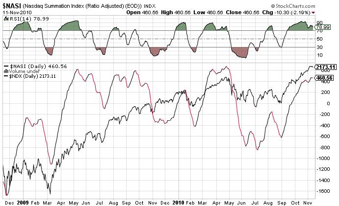 Otra forma de observar el mercado es a través de indices de amplitud como el Nasdaq Summation Index. Que elija el Nasdaq y no el NYSE es porque ne el NYSE cotizan muchas cosas que no son empresas. El NASI ($nasi en stockcharts) mide la amplitud del mercado mediante la suma de las acciones que suben menos las acciones que bajan.