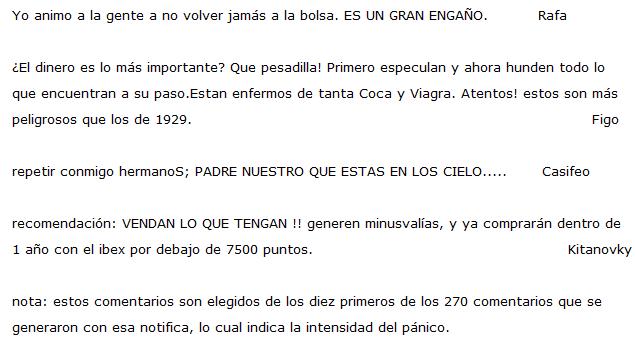 ¿Por qué? pues porque muchas veces no contamos con tanto titular espectacular como narré en aquél capítulo y muchas veces los medios on-line a las 12 de la mañana ponen un titular y si el mercado sube un 1% cambian su titular a la media tarde. Es decir casi siempre el medio se ajusta a lo que hagan los precios, pero la emoción que emanan los lectores en sus comentarios a esas noticias es bastante más estable.
