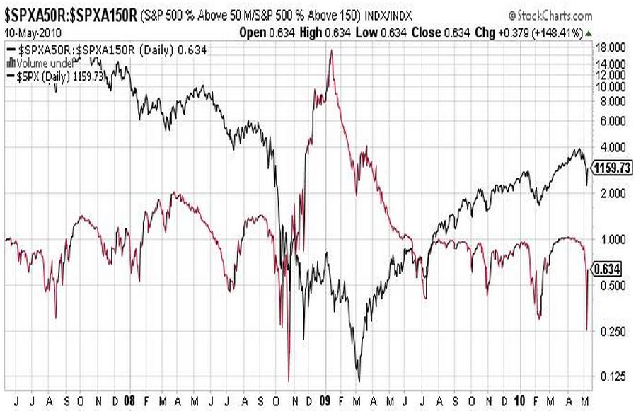 Este indicador es un ratio que divide el % de acciones sobre la media de 50 sesiones por el % de acciones sobre la media de 200 sesiones. El resultado es un ratio menos afectado por la tendencia que otros indicadores de amplitud.