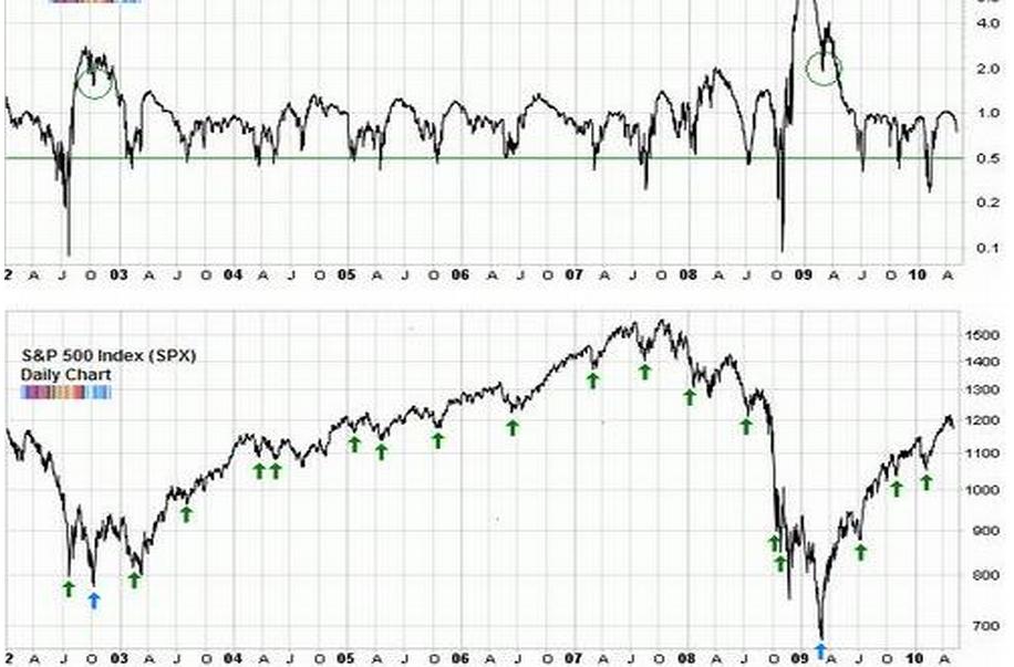 Este ejemplo de la imagen es el peor que podía poner porque en medio hay un evento extremo como fue octubre de 2008. En cualquier caso no siempre hay que poner ejemplos bonitos. Como se ve el ratio normalmente fluctúa entre 0.5 y 1. A veces va más arriba o más abajo. También y aprovechando el ejemplo de octubre de 2008, se ve que cuando el ratio llega a 0.1 es un punto de sobreventa extremo y por tanto insostenible y el mercado al menos ha de consumir tiempo sin caer tan rápido. También se ve que después de que eso ocurre el ratio se vuelve loco al alza. Esto hay que tenerlo en cuenta. En esta vida todo es contexto.