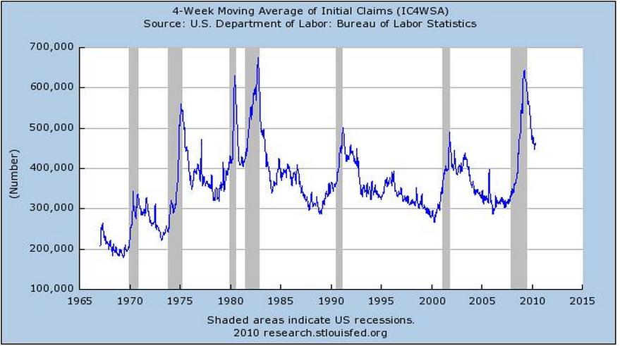 El dato de las 4 semanas de peticiones iniciales de desempleo está invertido, pero muestra claramente la correlación. Este dato es muy útil porque mientras que el mercado de acciones puede ser muy engañino para detectar un suelo, el dato de peticiones iniciales suele ser como un oscilador que en momentos de máximo pánico se gira al alza con bastante claridad.