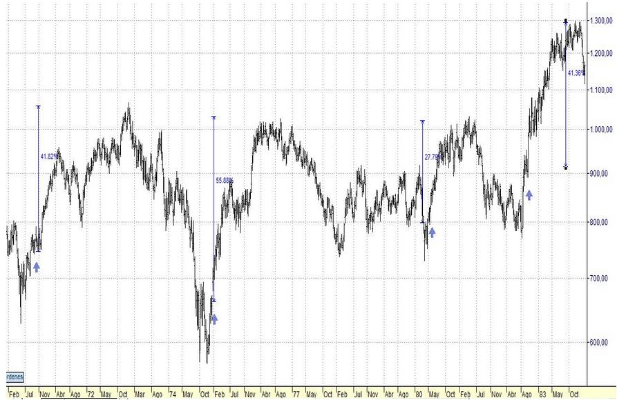 En primer lugar hay que subrayar que hay que tener un método para detectar cuando este indicador económico se está girando. Asi que al dato en sí (la media de 4 semanas de peticiones iniciales de desempleo) podemos agregarle una media o cualquier otro método. Hoy simplemente vamos a centrarnos en que ocurrió cada vez que el dato empezó a mejorar y resulta que coincide con suelos muy importantes de mercado y con rally sostenidos.