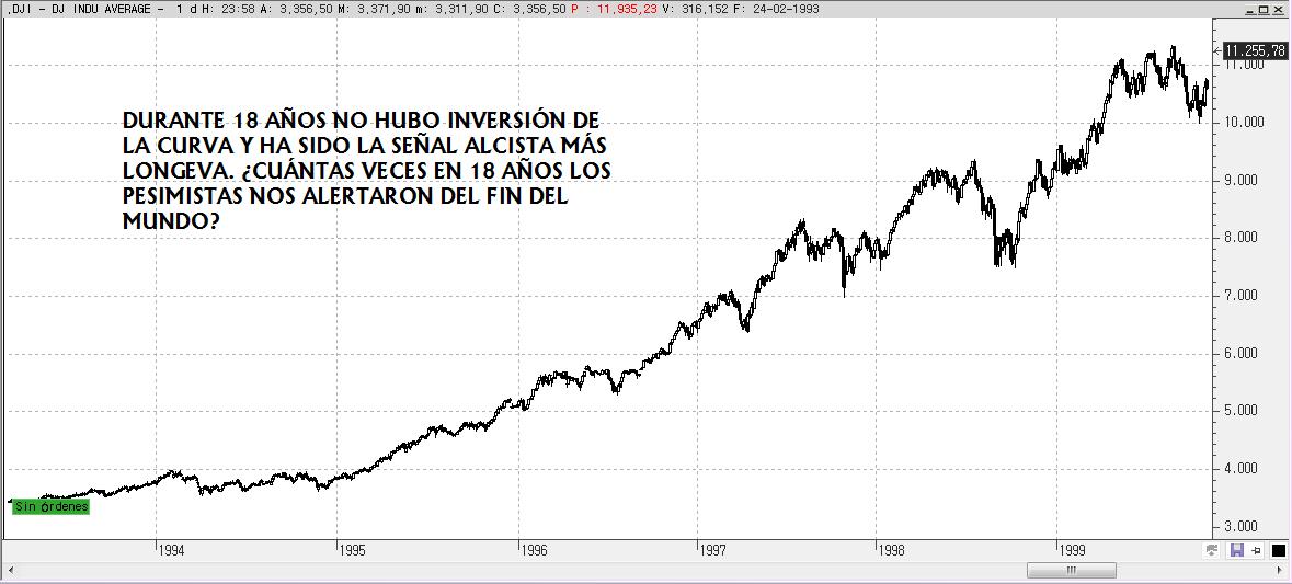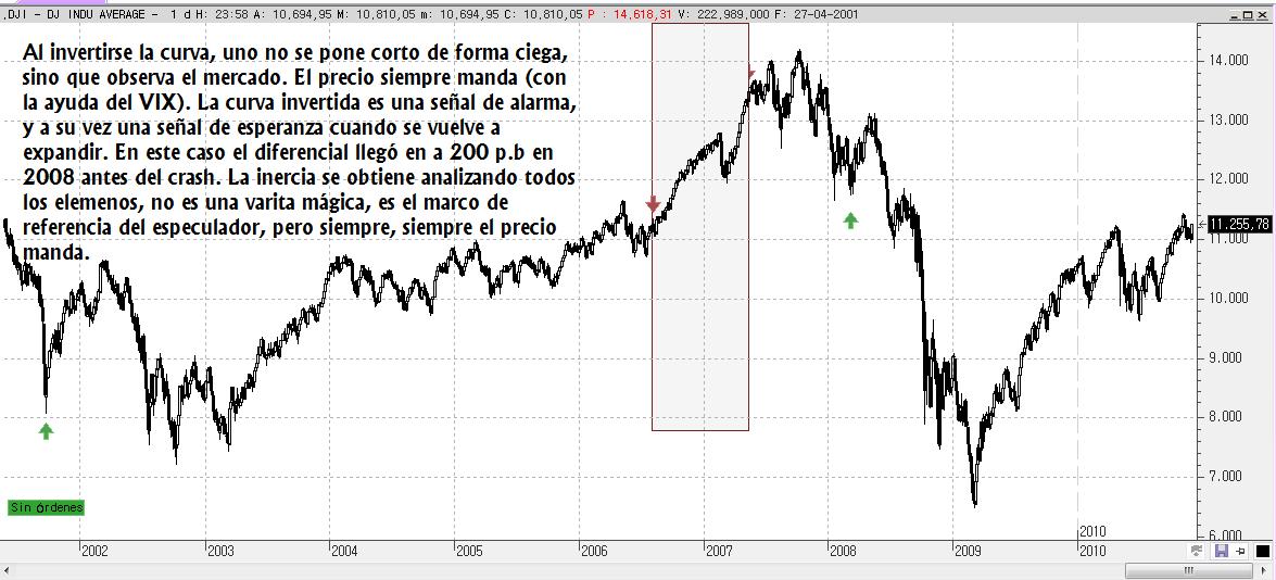Como se observa, hay señales especialmente afortunadas y hay señales totalmente erróneas (las menos). Y es que el mercado es impredecible por su naturaleza. Como he escrito en esta última diapositiva el precio es el que manda. Figurarse cual es la inercia que gobierna el mercado es un trabajo de análisis que requiere el uso de todas las herramientas y sobre todo ponerlas en contexto. Contexto, contexto y contexto. La última vez que se invirtió la curva el mercado estaba muy alcista. Sólo un loco busca corto cuando nada sugiere que el precio esté cayendo. En esa época el mercado nos regaló 2 dobles suelos en 2006 y 2007, y ya he dicho que contra eso no se argumenta. El precio y el VIX nos van a decir en todo momento como hemos de interpretar la curva de tipos para así hallar cual es la inercia.