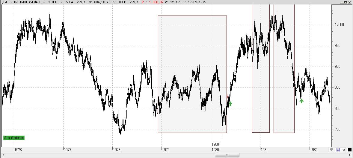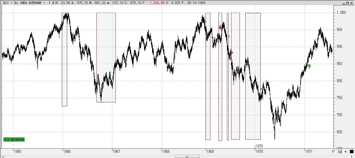 Observemos ahora el mercado (Dow Jones) en distintas etapas del último medio siglo. Las zonas marcadas corresponden a inversión de la curva (las letras del tesoro más rentables que los bonos a 10 años), y las flechas verdes marcan cuando los bonos daban más rentabilidad que las letras (al menos 200 p.b), es decir había incentivo por el riesgo. Se ve que por lo general la inversión de la curva sienta mal al mercado y que cuando los bonos son al menos 200 p.b. más rentables le sienta bien al mercado.