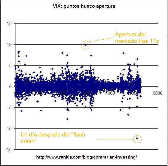 Lo más curioso es que el mayor hueco de todos los tiempos no fue al alza, sino a la baja. He señalado en el gráfico los dos huecos más grandes de la historia del VIX. Uno fue al alza cuando el 17 de septiembre de 2001 se reabrieron los mercados. Es bastante difícil imaginar situaciones de mayor pánico que la de esa semana. El hueco a la baja fue precisamente este año, justo después del flash crash cuando el índice VIX abrió 12 puntos más abajo.